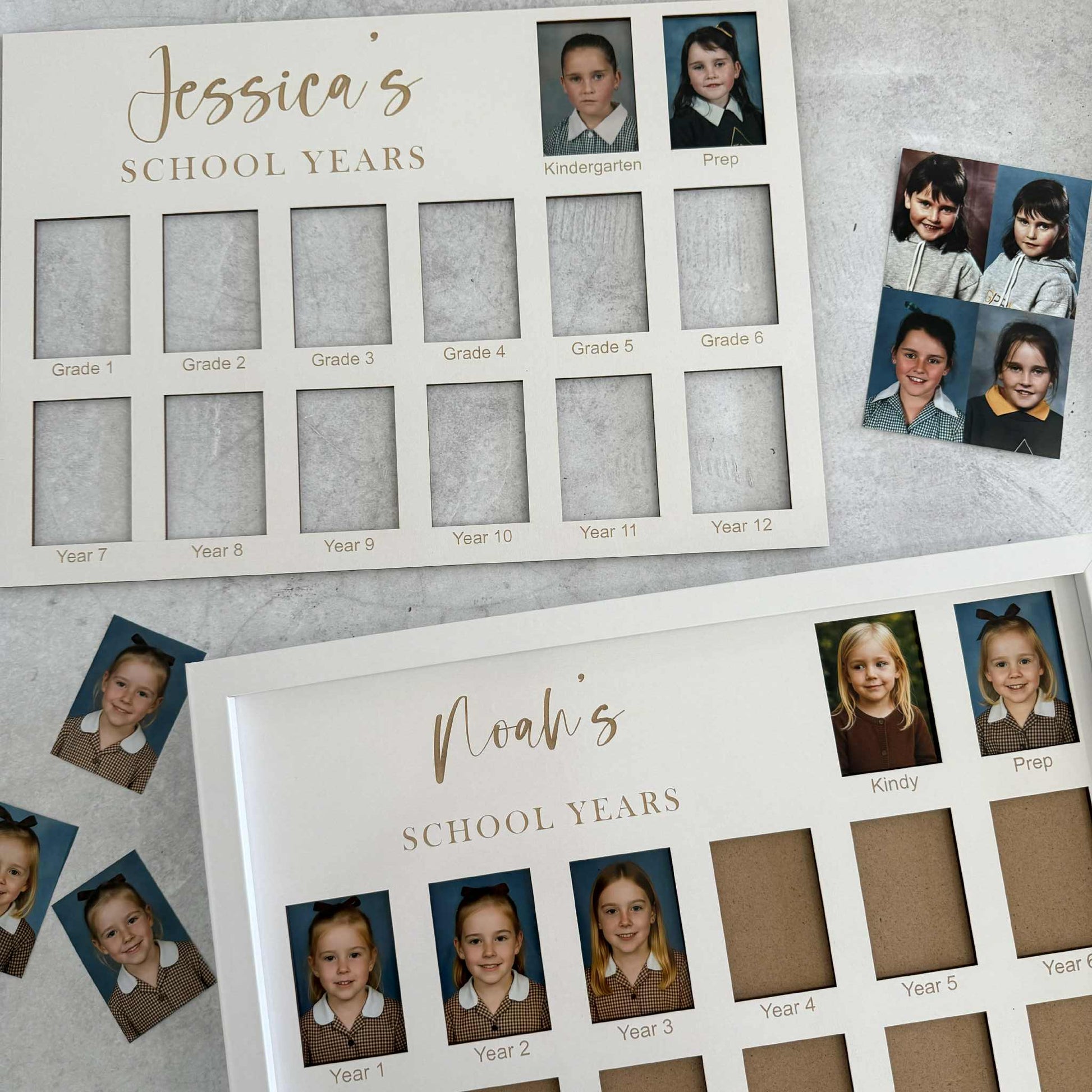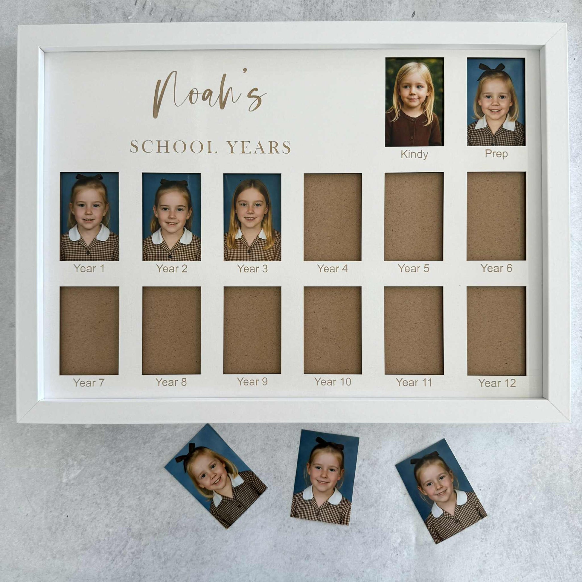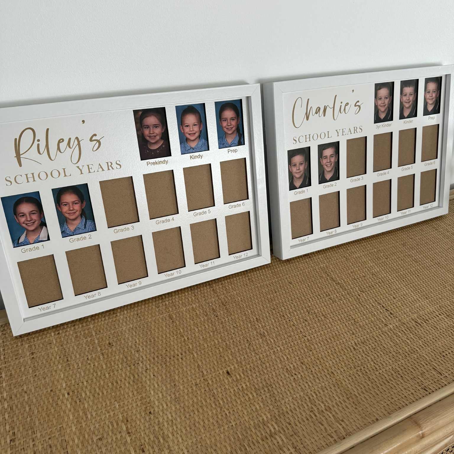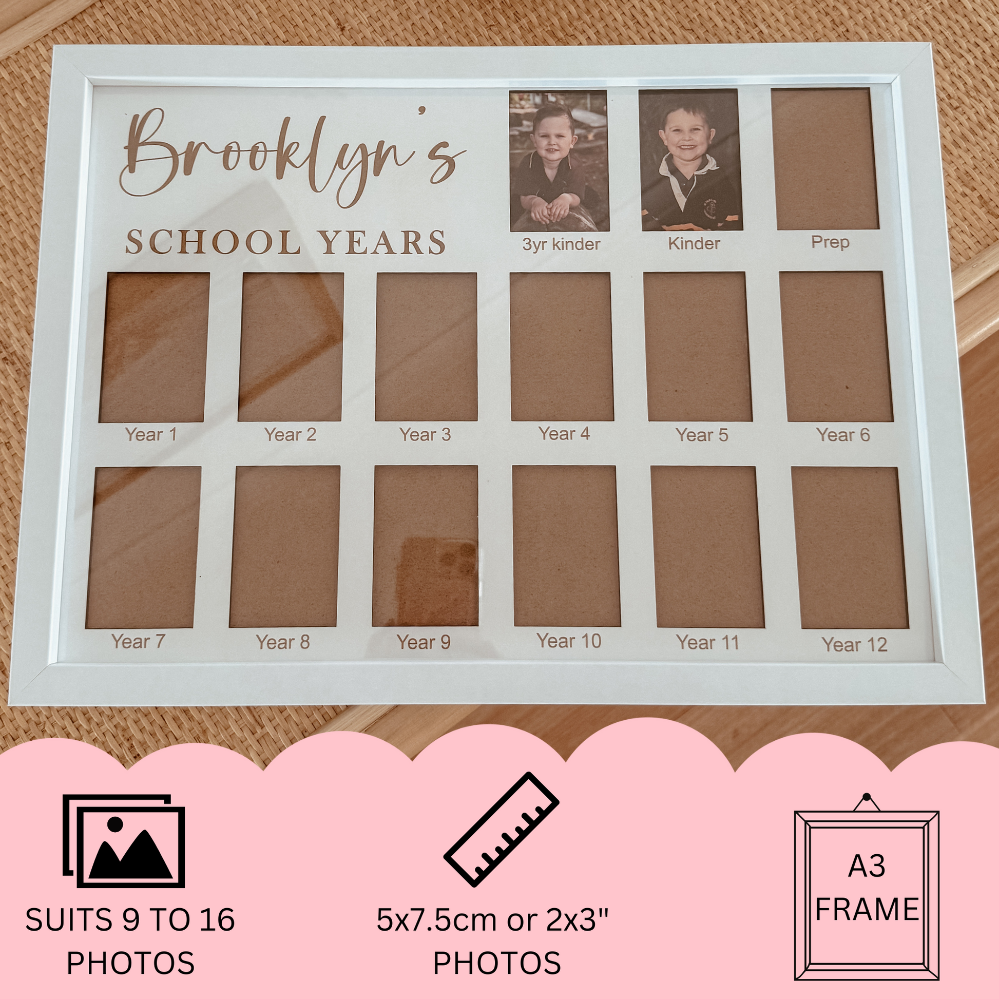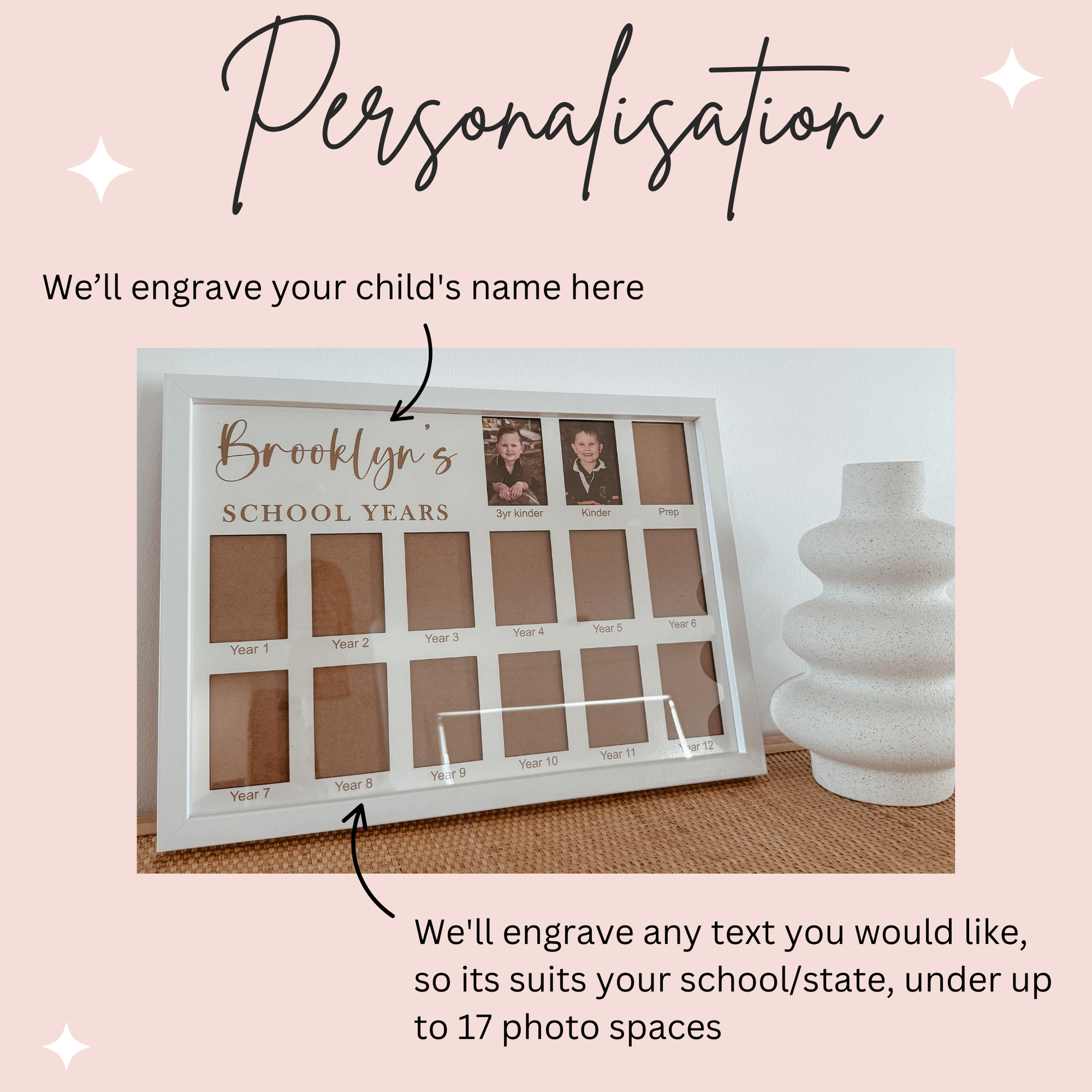 We'll add your child's name & the year level's/text you need under each photo space to suit your individual school & state. Simply enter what you would like engraved in the boxes provided above when adding to cart.